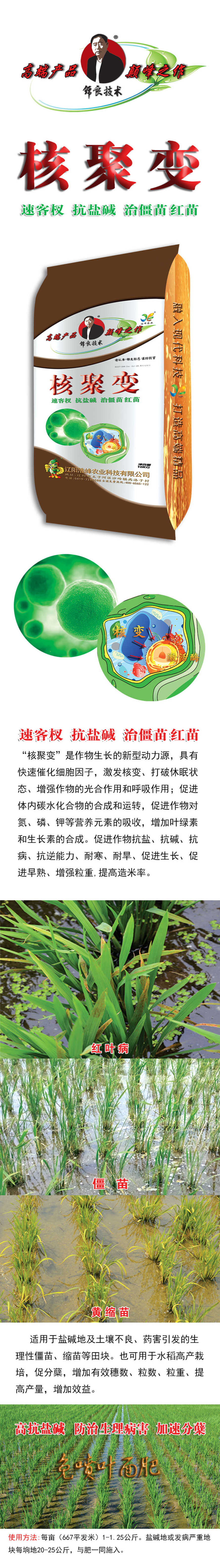 “核聚變”是作物生長的新型動力源,具有快速催化細胞因子,激發(fā)核變、打破休眠狀態(tài)、增強作物的光合作用和呼吸作用;促進體內碳水化合物的合成和運轉,促進作物對氮、磷、鉀等營養(yǎng)元素的吸收,增加葉綠素和生長素的合成。促進作物抗鹽、抗堿、宀 ⒖鼓婺芰?、亩d?、亩d?、促进生长、促进钥r臁⒃鑾苛V?,提高造米率。